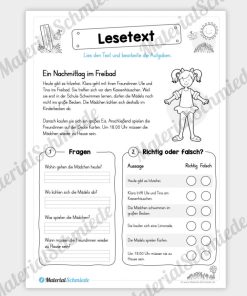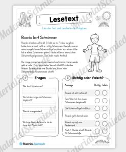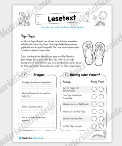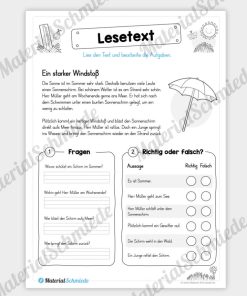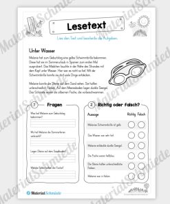 Die Kinder sollen sich jeweils einen Text durchlesen. Anschließend wird das Leseverständnis auf zwei verschiedene Arten abgefragt. Zum einen sollen die Kinder ein Wort zu einer Frage aufschreiben, zum anderen Aussagen mit richtig oder falsch beantworten (ankreuzen). Auf dem PDF sind insgesamt 10 Lesetexte rund um das Thema Sommer vorhanden.