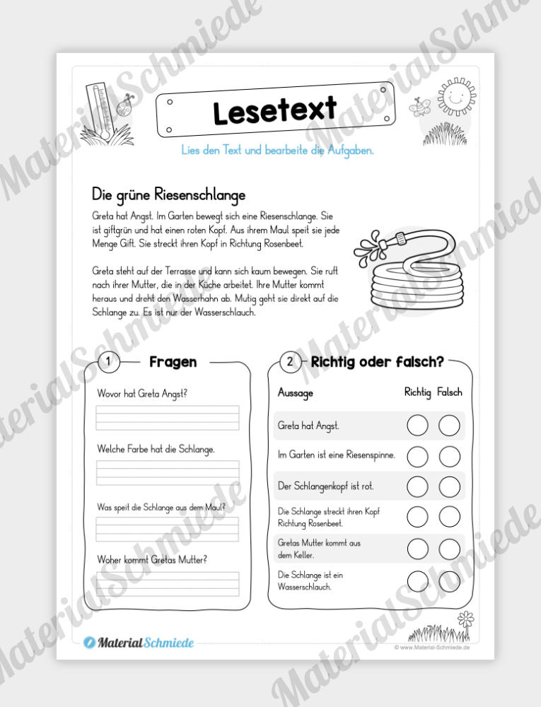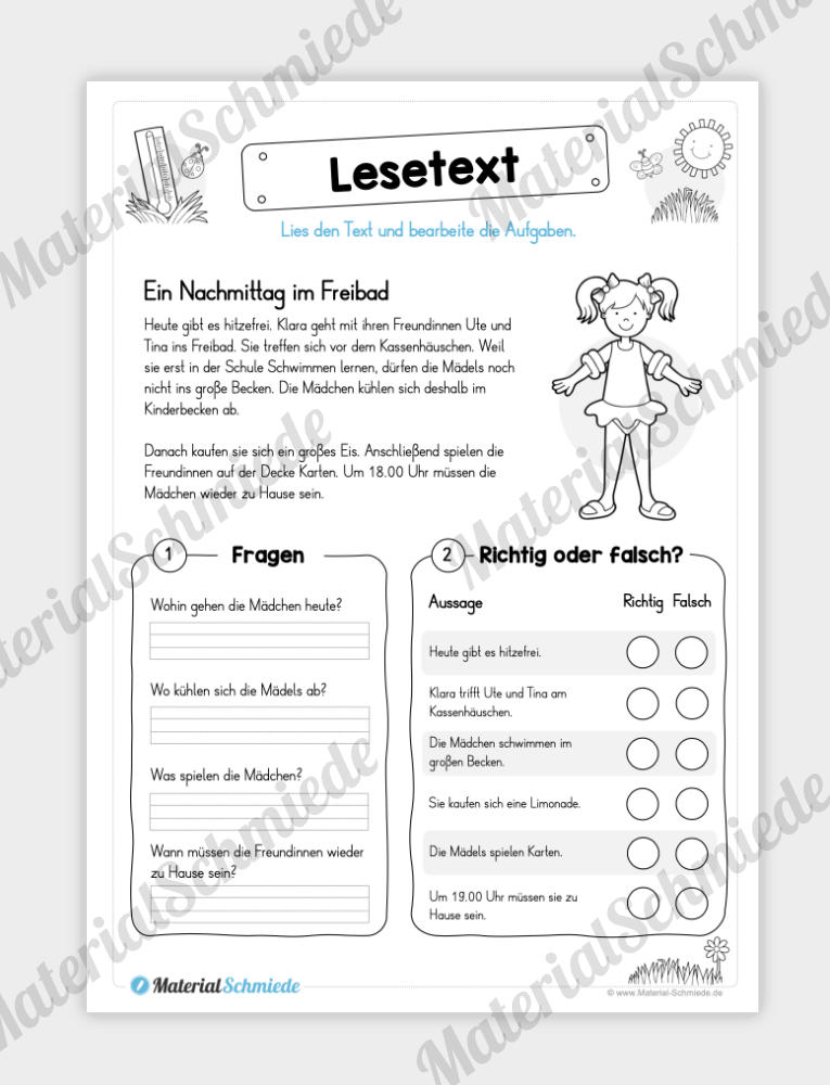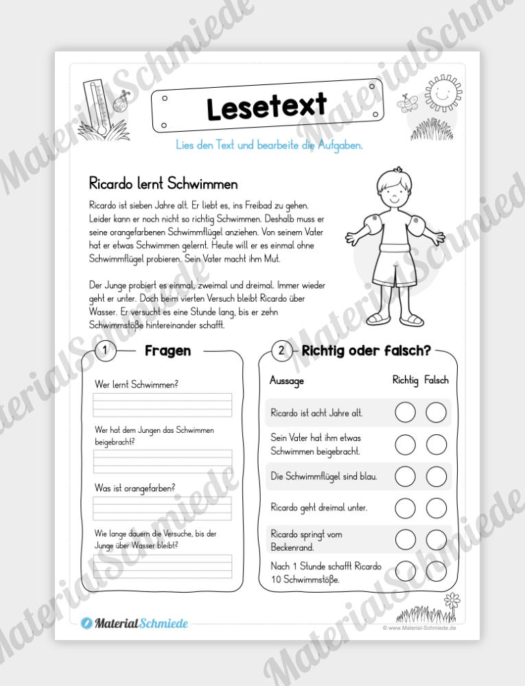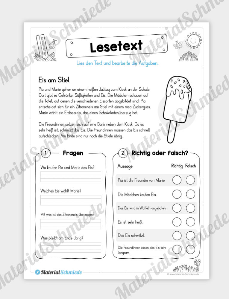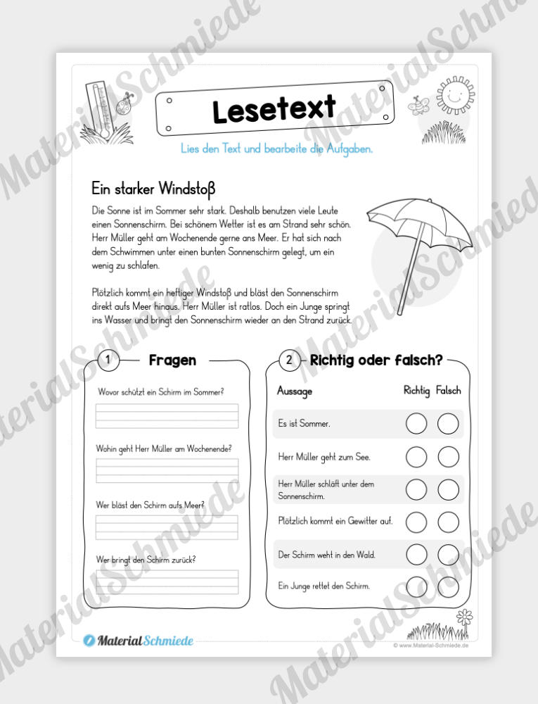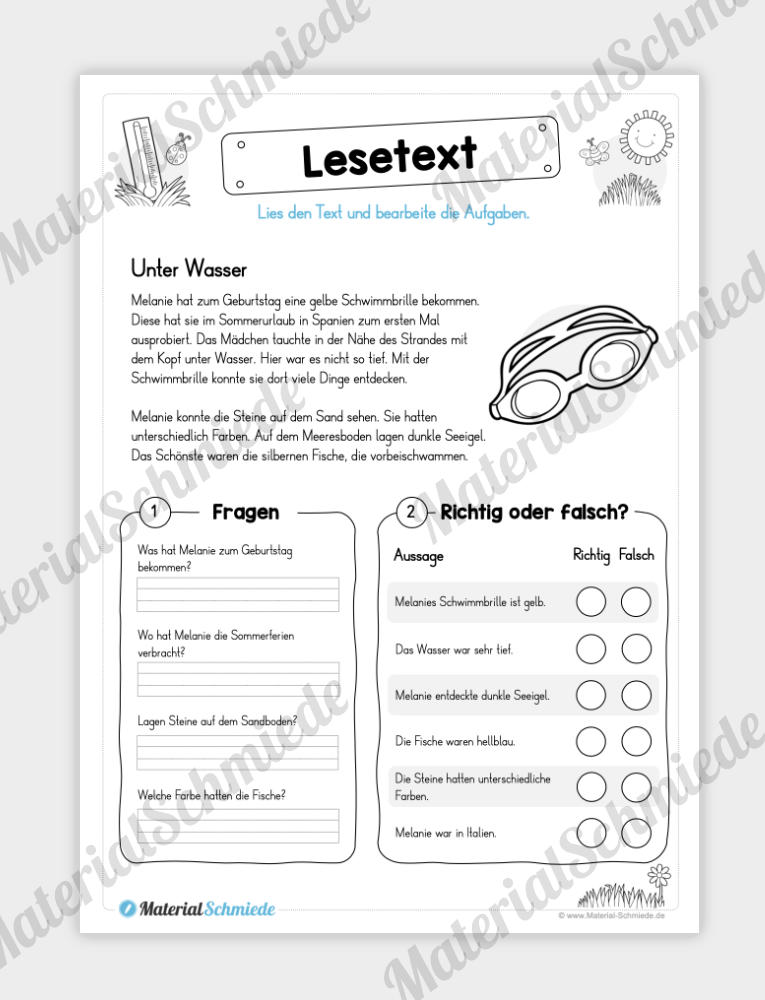 Die Kinder sollen sich jeweils einen Text durchlesen. Anschließend wird das Leseverständnis auf zwei verschiedene Arten abgefragt. Zum einen sollen die Kinder ein Wort zu einer Frage aufschreiben, zum anderen Aussagen mit richtig oder falsch beantworten (ankreuzen). Auf dem PDF sind insgesamt 10 Lesetexte rund um das Thema Sommer vorhanden.