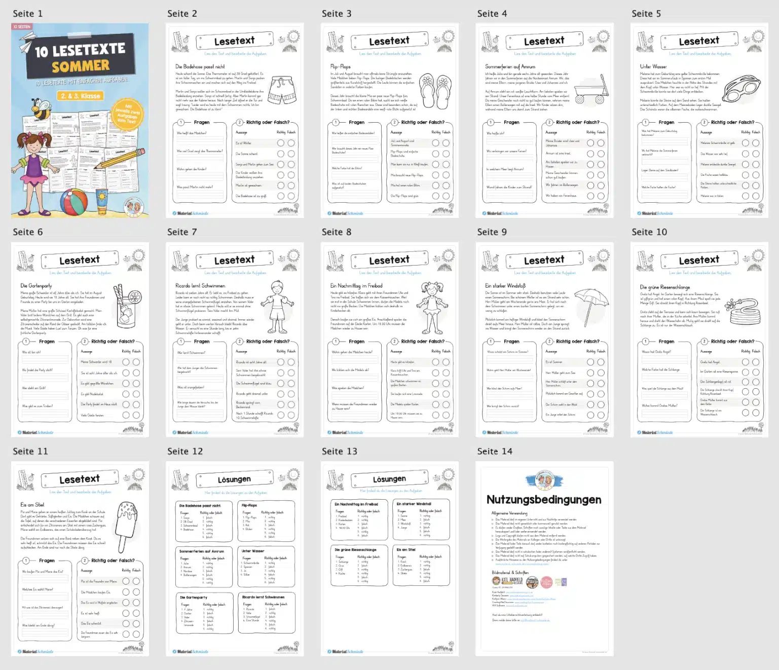Dieses Materialpaket enthält insgesamt 10 verschiedene Lesetexte zum Sommer mit jeweils zwei Aufgaben.