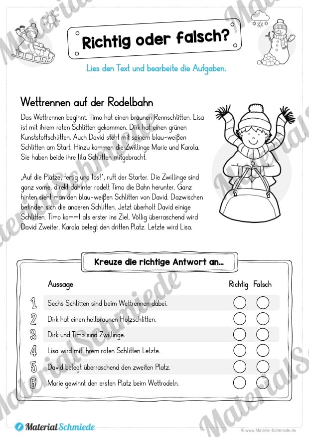 Mit Hilfe dieser Übungen lernen die Schüler einfache Texte zu lesen und den Inhalt zu verstehen. Denn die Antworten können nur korrekt gegeben werden, sofern die Kinder den Inhalt verstanden haben. Die Lösungen sind natürlich ebenfalls vorhanden.