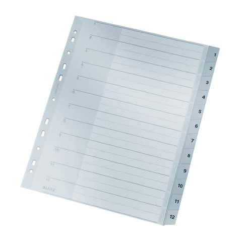 Plastikregister 1-12, A4, Überbreite. Mit beschriftbarem Deckblatt aus Karton und Universallochung. Material: Polypropylen (PP). Blattanzahl: 12. Format: 238 x 297 mm. Farbe: grau.