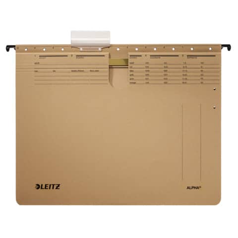Leitz Hängehefter ALPHA®, für kaufmännische Heftung. Für die geheftete Ablage von Einzelakten. Mit Daumenausschnitt und fest eingezacktem Aufreihband, Hängeschiene mit kunststoffumsinterten Hängenasen, Vollsichtreiter und auswechselbaren Blanko-Schildchen. Material: Natron-Karton 250 g/qm (RC). Für A4. Farbe: naturbraun.