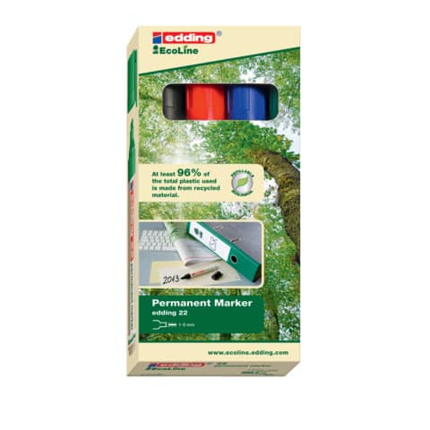 Edding 22 Permanentmarker EcoLine. Geruchsarme Tinte ohne Zusatz von Xylol/Toluol, wasserfest, lichtbeständig. Keilspitze, Spitze austauschbar. Kunststoffteile insgesamt zu mindestens 96% aus recyceltem Material. Papieretikett. Marker mit Filtersystem. Schnell trocknend. Zum Beschriften von fast allen Oberflächen. Kappe umsteckbar, Clip vorhanden. Kappe und Mundstück in Schreibfarbe. Schaftfarbe: umweltfreundliches Design. Strichstärke: ca. 1 – 5 mm. Schreibfarbe: schwarz, rot, blau und grün.