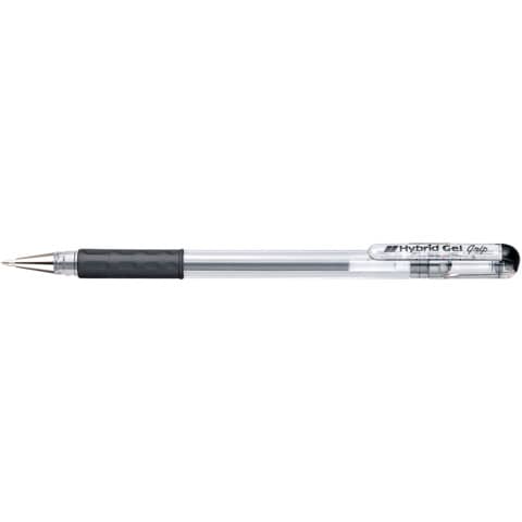 Gel-Tintenroller Hybrid Gel Grip K116. Mit Druckmechanik. Mine KF6-A auswechselbar mit Metallspitze. Art der Tinte: pigmentierte Gel-Tinte. Schaftmaterial: Kunststoff ohne PVC, gummierte Komfortgriffzone. Mit Kunststoffclip. Brillante Farben, weich fließende Tinte, wasserfest und lichtecht. Strichstärke: 0,3 mm. Schreibfarbe: schwarz. Schaftfarbe: transparent.