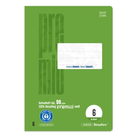 Schulheft Green. Ausführung Papier: 100% Recycling Pure Impact, 90 g/m². Ausstattung: Heftung am Rücken. Papierformat: DIN A5 = 14,8 cm x 21,0 cm. Lineatur/Lineatur-Nr.: blanko, 6. Anzahl der Blätter: 16 Blatt. Farbe des Einbandes: farbig mit Motiv. Blauer Engel.
