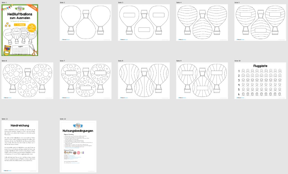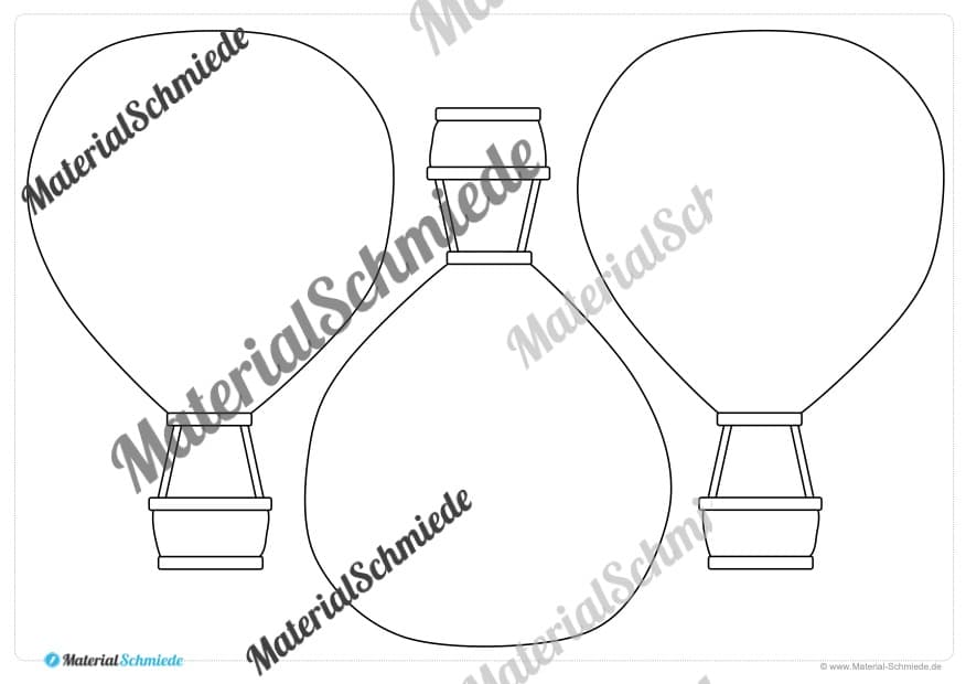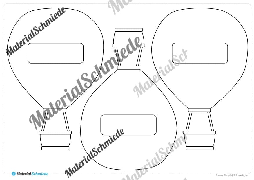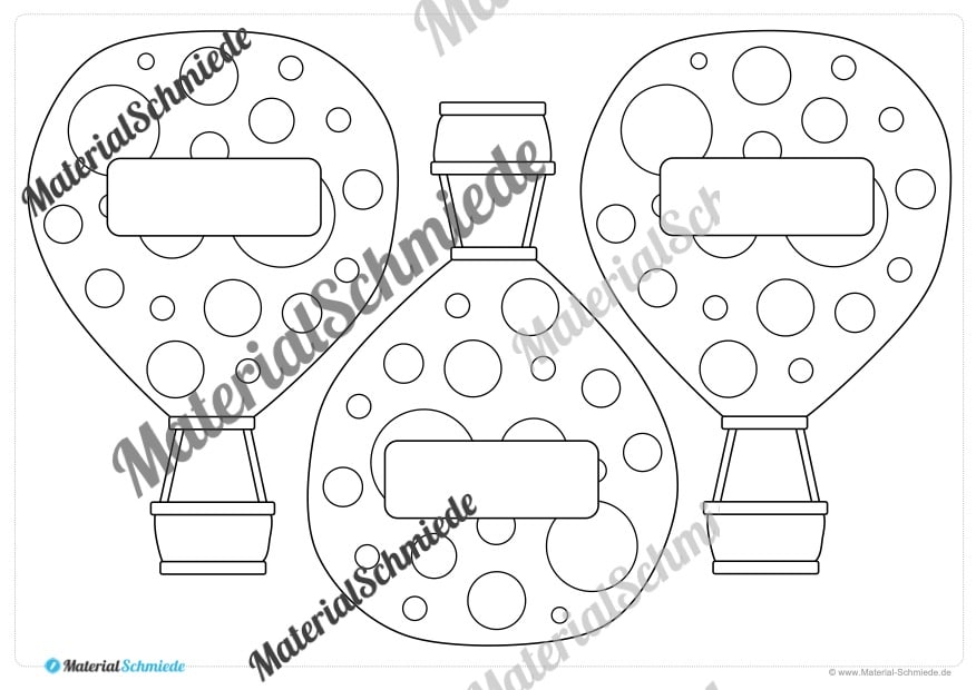 Wir stellen euch die Heißluftballons mit 4 unterschiedlichen Mustern jeweils in schwarz-weiß zur Verfügung. Dabei könnt ihr wählen, ob ihr die Version mit oder ohne Platzhalter für den Namen auf dem Ballon nutzen möchtet. Alternativ können die Schüler ihren Namen auch in den Korb des Ballons schreiben.