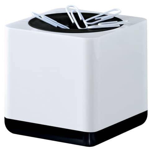Klammernspender i-Line – ein elegantes, formschönes Accessoire mit großem Fassungsvermögen. Die hochglänzende Optik und klare Linienführung setzen moderne Akzente auf jedem Schreibtisch. Kompromisslose Qualität für moderne Bürowelten. Ein echter Blickfang. Durch den Ringmagneten sind die Büroklammern immer griffbereit und leicht zu entnehmen. Einfaches Nachfüllen durch entnehmbaren Magneten. Hochwertige, stabile und schwere Ausführung. Besonders möbelschonend durch einen vollflächigen, rutschfesten Schaumstoffboden. Design und Farbe sind abgestimmt auf alle Produkte der i-Line Serie. Made in Germany. Material: hochwertiger Kunststoff (ABS). Außenmaße: (B x T x H): 69 x 69 x 70 mm. Farbe: weiß-schwarz.