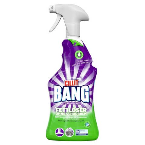 CILLIT Bang Kraftreiniger Universal Fettlöser 750ml. Der CILLIT BANG Kraftreiniger Universal Fettlöser leistet eine hohe Reinigungskraft und ist, aufgrund der Sprühflasche, leicht anwendbar. Das Reinigungsmittel lässt sich in beinahe allen Bereichen einsetzen und reinigt Besteck, Töpfe, Pfannen, Grille, Kacheln, Edelstahl und vieles mehr, sollte jedoch nicht auf Holz, Vinyl, Gummi oder Textilien aufgetragen werden. Der Haushaltsreiniger besitzt eine 100% Kraft bei der Bekämpfung von Fetten. Die Nachhaltigkeit des Putzmittel ist durch das Cleanright Siegel geprüft und bestätigt. Zusätzlich besteht die Flasche zu 75% aus recyceltem Plastik und reduziert daher zusätzlich die Umweltlast.