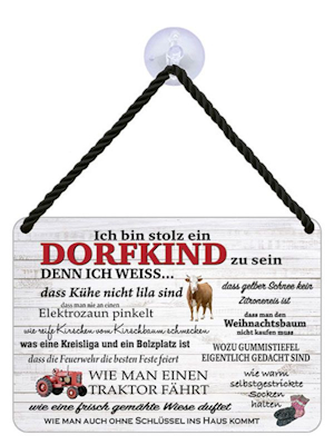 Spruchschild zum Aufhängen: Ich bin stolz ein Dorfkind zu sein denn ich weiss… dass Kühe nicht lila sind dass man nie an einen Elektrozaun pinkelt wie reife Kirschen vom Kirschbaum schmecken was eine Kreisliga und ein Bolzplatz ist dass die Feuerwehr die besten Feste feiert wie man einen Traktor fährt wie eine frisch gemähte Wiese duftet wie man auch ohne Schlüssel ins Haus kommt dass gelber Schnee kein Zitroneneis ist dass man den Weihnachtsbaum nicht kaufen muss wozu Gumistiefel eigentlich gedacht sind wie warm selbstgestrickte Socken halten Kulthänger Stolzes Dorfkind