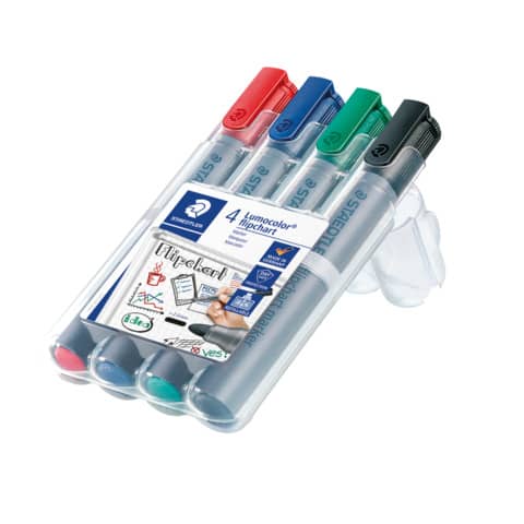 Flipchart-Marker Lumocolor®. Nachfüllbar. Bezeichnung der Schreibflüssigkeit: geruchlose Tinte, xylol- und toluolfrei. Kann einige Tage offen liegen bleiben, ohne einzutrocknen. Ausführung der Spitze: Rundspitze. Efficient for ecology: blockierte Spitze, Schaft und Kappe aus PP garantieren lange Lebensdauer, einfaches Nachfüllen mit Tankstelle 488 56. Material des Schaftes: PP. Kappe umsteckbar. Clip vorhanden. Farbe des Schaftes: anthrazit. Strichstärke: 2 mm. Schreibfarbe von Schreibgeräten: 2 rot, 3 blau, 5 grün, 9 schwarz. Ausführung des Inhalts mit Packung: Staedtler® Box mit 4 Farben.