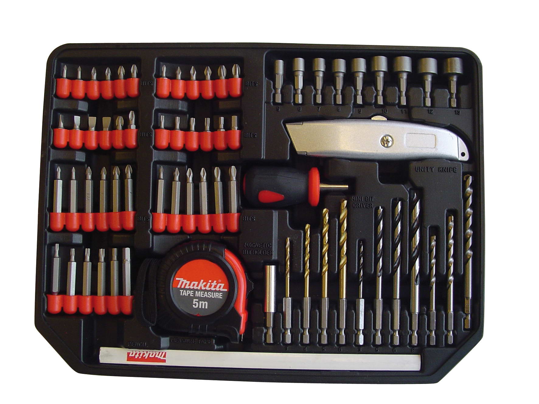 1 Handgriff – 1 Bithalter – 1 Maßband – 1 Zimmermannsbleistift – 1 Universalmesser