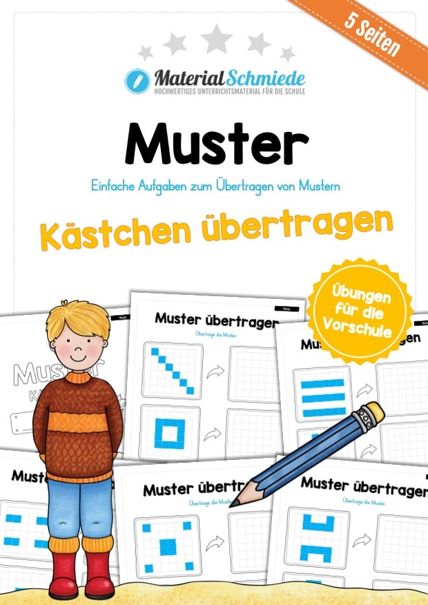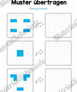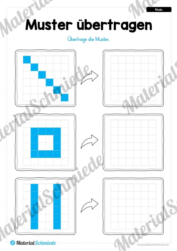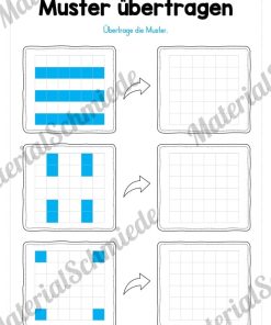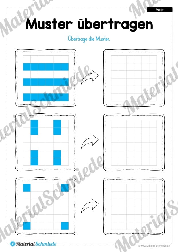 Die Kinder finden auf jedem der 5 Arbeitsblätter 3 Muster in Form von Kästchen, welche übertragen werden sollen.