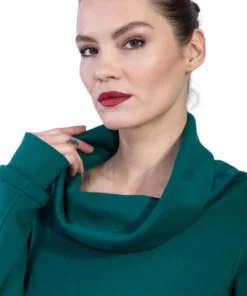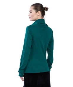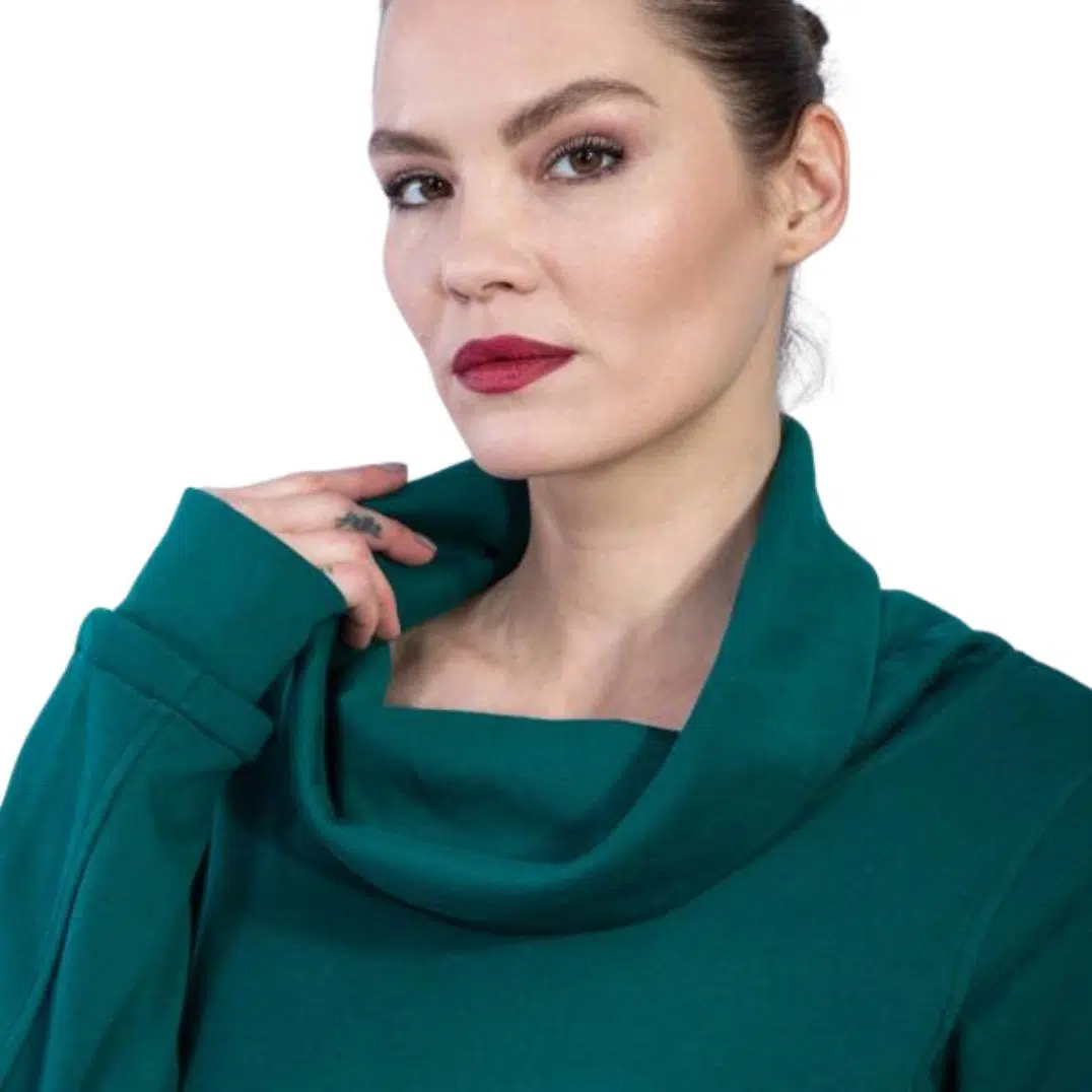 Der Pullover „Peanut“ P.Blue aus Bio GOTS Interlock Jacquard ist leicht tailliert, hat einen Rollkragen, Eingriffstaschen mit Reißverschluss, Ziernaht und unser Logo-Label im Vorderteil