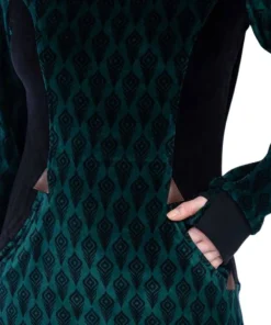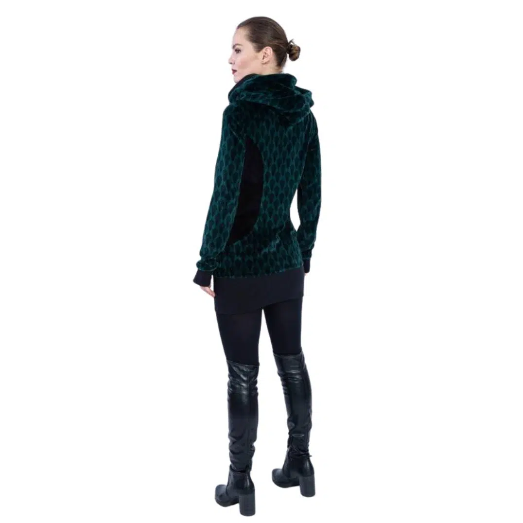 Der Pullover „Tunika Steffi“ – Black Feather ist leicht tailliert, hat eine 2 in 1- Kapuze mit Kordel (wandelbar zum Rollkragen),