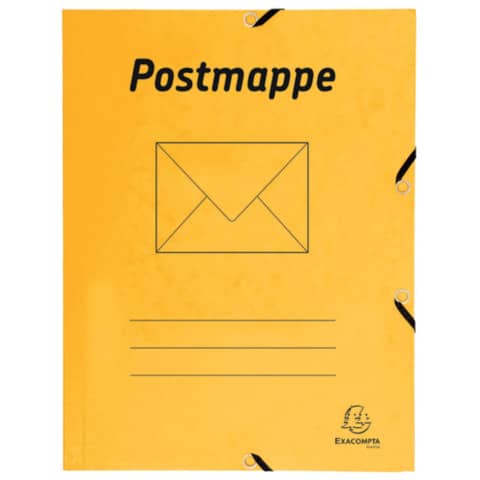 Postmappe A4 aus Colorspan-Karton Postmappe aus starkem Colorspan-Karton 425g/qm mit 3 Klappen und Gummizug für einen sicheren Verschluss der Unterlagen. Mit Aufdruck Postmappe sowie Beschriftungslinien auf dem Deckel. In typischem Gelb, für Briefzustellungen im Unternehmen oder auch für Unterlagen in der Schule. Größe (B x H): 24×32 cm für Format DIN A4.
