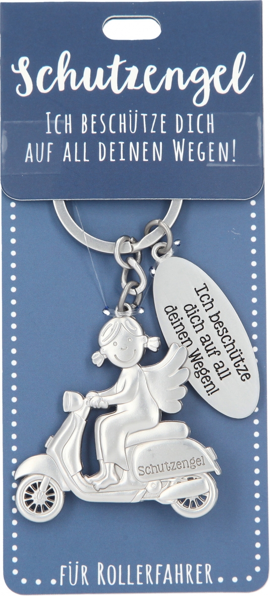 Ein Schutzengel für unterwegs: Süße, figürliche Schlüsselanhänger mit kleinen Botschaften wie z. B. „Ich passe immer auf dich auf!“ oder „Allzeit gute Fahrt!“ für Auto-, Mororrad-, Roller- oder Fahrradfahrer. Aus Metall (Zinklegierung). Schutzengel Schlüsselanhänger Sicher im Straßenverkehr
