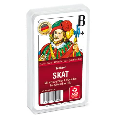 Skat ist das beliebteste Kartenspiel der Deutschen für drei oder vier Spieler und hat seinen Ursprung um 1820 in der „Skatstadt“ Altenburg. Das Spiel mit dem vor allem in Westdeutschland gespielten französischen Bild ist besonders benutzerfreundlich für Senioren im Format 56 x 100 mm im Plastiketui erhältlich.