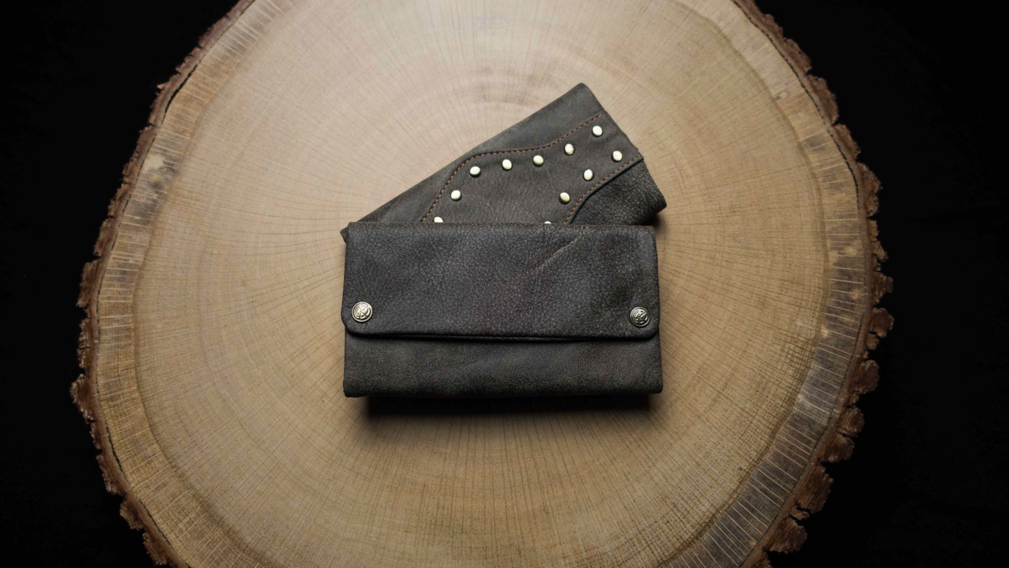 Aussen und Innen: Braunes Glattleder mit Bronzefarbenen Nieten.