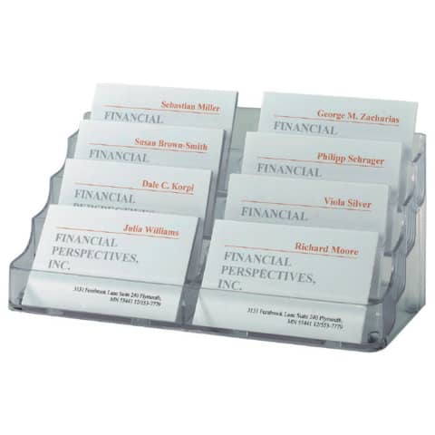 Visitenkarten-Aufsteller mit acht Fächern für die perfekte Präsentation verschiedener Visitenkarten. Standfest und rutschsicher, hochwertige glasklare Optik. Pro Fach für ca. 70 Karten bis max. 94 mm Breite.