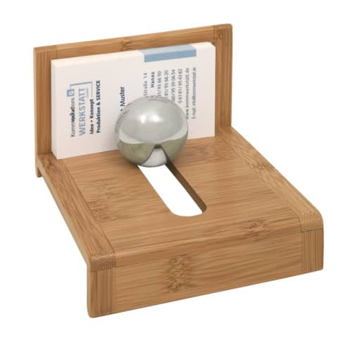 WEDO® Visitenkartenhalter mit Stahlkugel, außergewöhnliches Accessoire aus der Bambus-Schreibtischgarnitur. Bambus wird als schnell nachwachsender Rohstoff nicht nur ökologischen Aspekten gerecht, sondern strahlt auch Wärme und Eleganz aus. Das moderne Design wird durch die trendige Materialkombination zusätzlich unterstrichen. Maße: 11,4 x 10 x 6,9 cm. Einzeln verpackt im attraktiven Geschenkkarton.