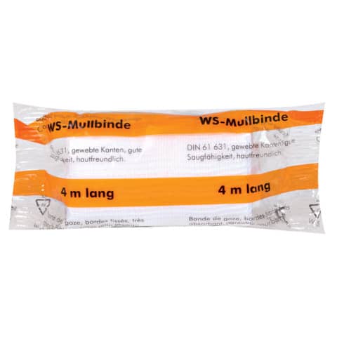 WS-Mullbinde 20 DIN 61631, Zellwolle 20-fädig, Kanten gewebt, gute Saugfähigkeit, hautfreundlich. Einzeln in Zellglas verpackt. Farbcode orange. Größe (BxL): 6 cm x 4 m.