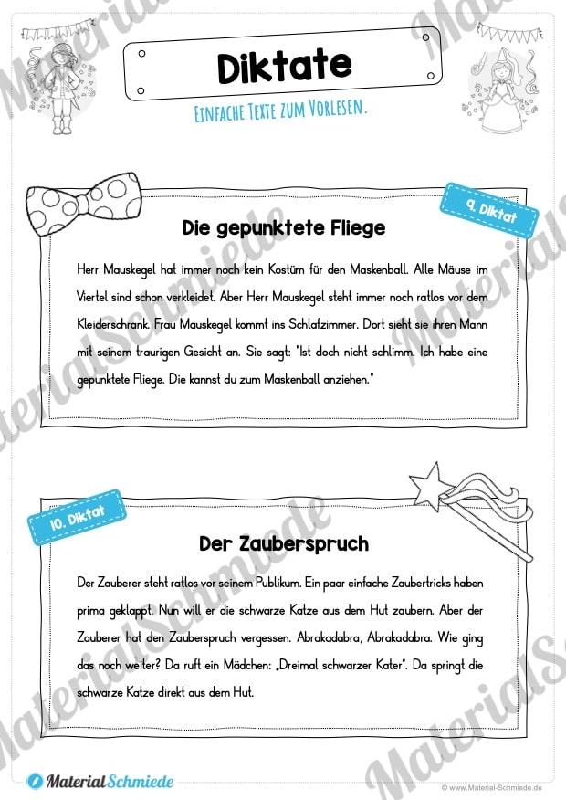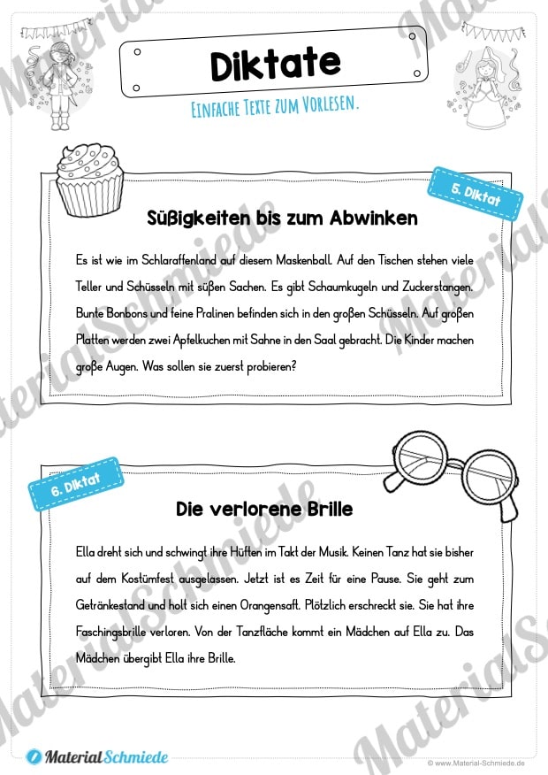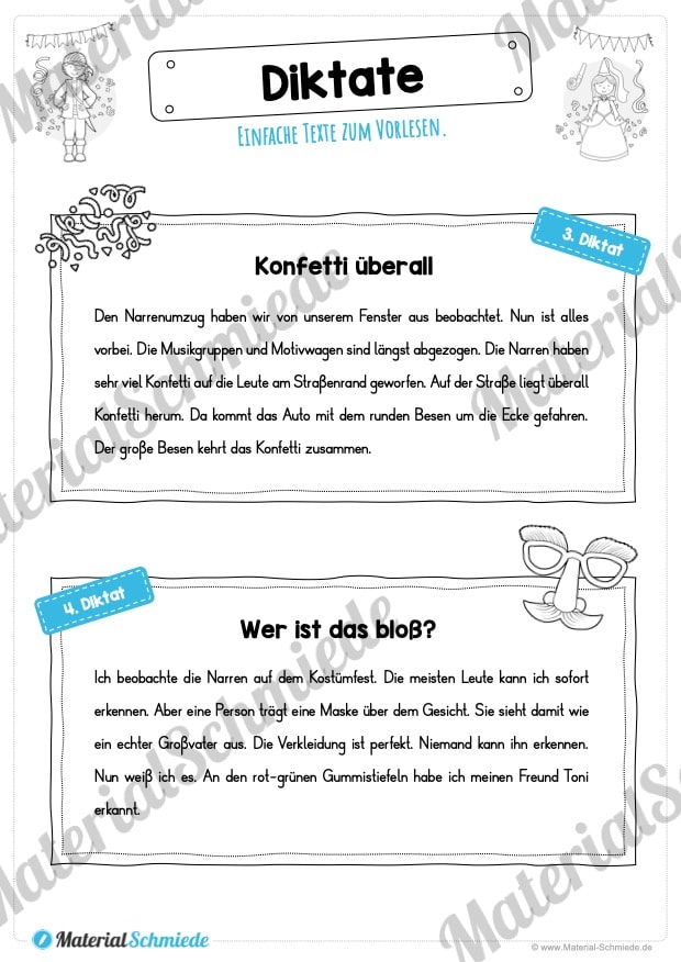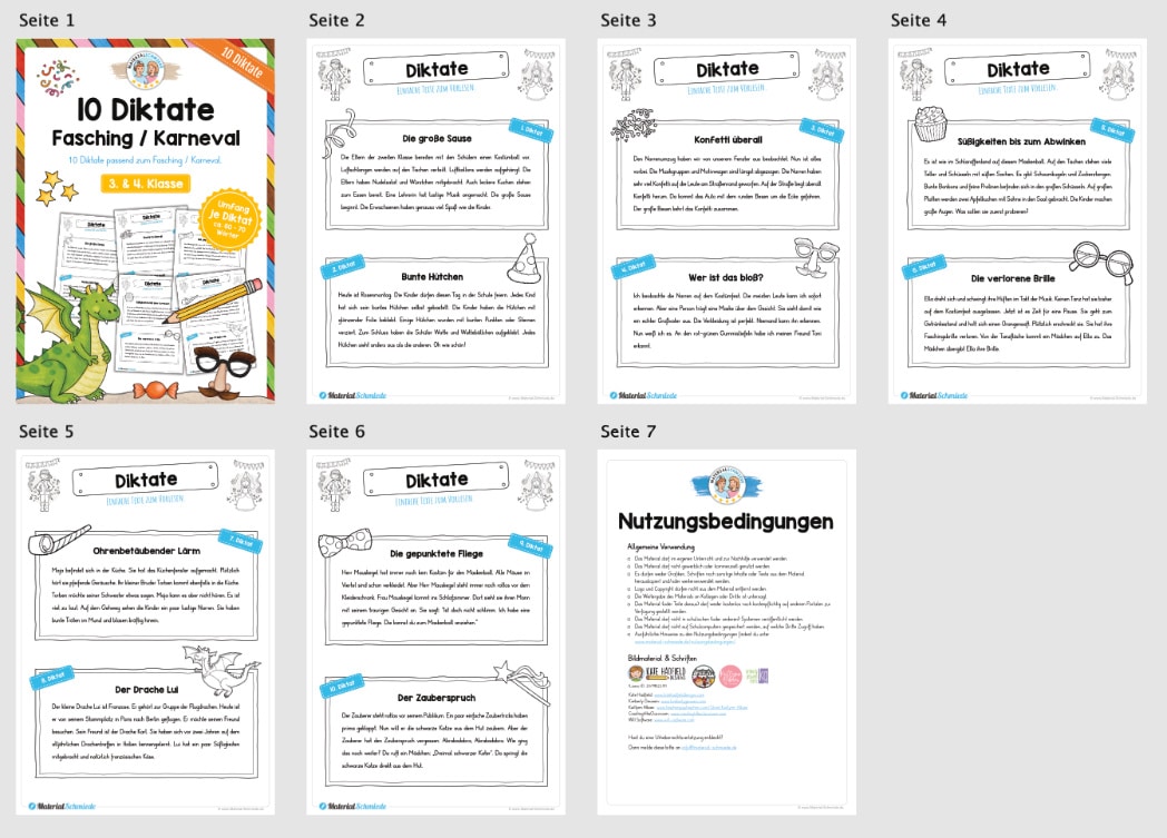 Dieses Unterrichtsmaterial beinhaltet insgesamt 10 Diktate zum Thema Fasching / Karneval. Alle Diktate sind relativ einfach gehalten, sodass ihr diese in der 3. und 4. Klasse zum Einsatz bringen könnt. Dabei besitzen die Diktate jeweils ca. 60-70 Wörter.