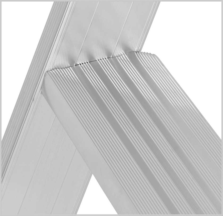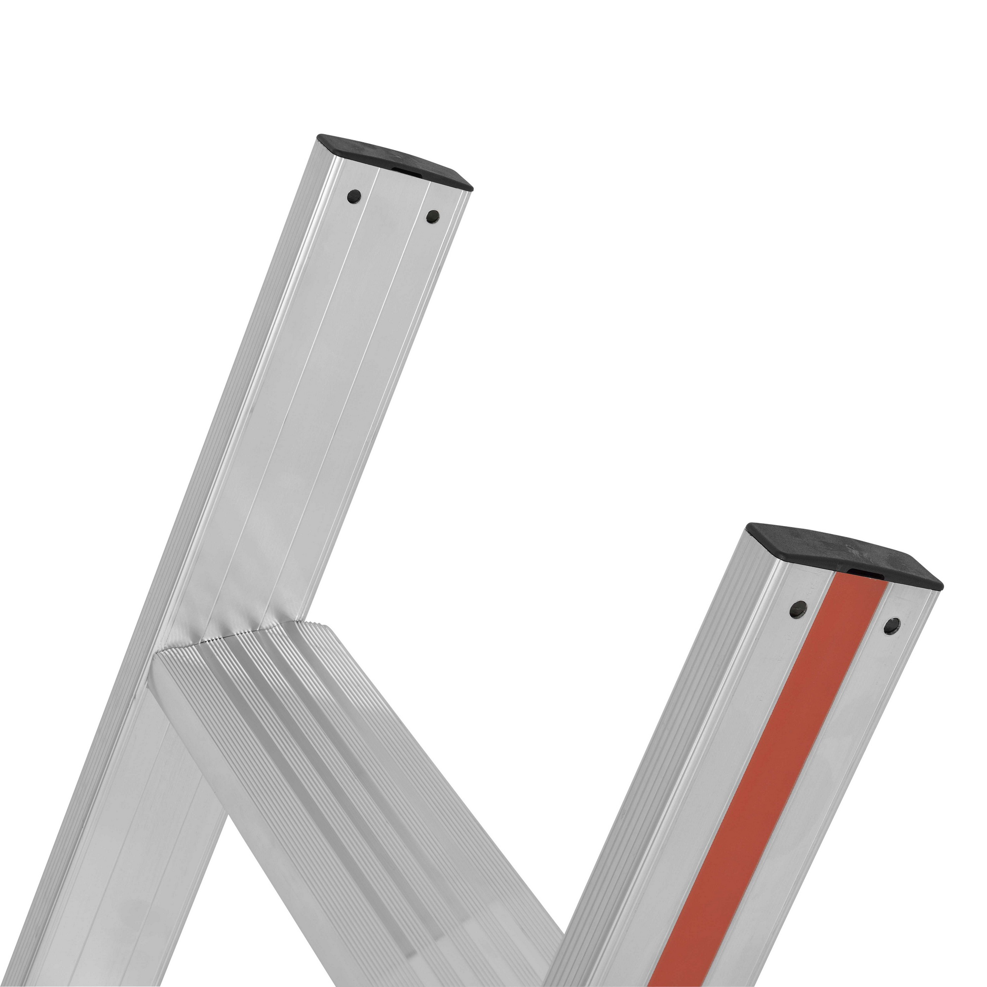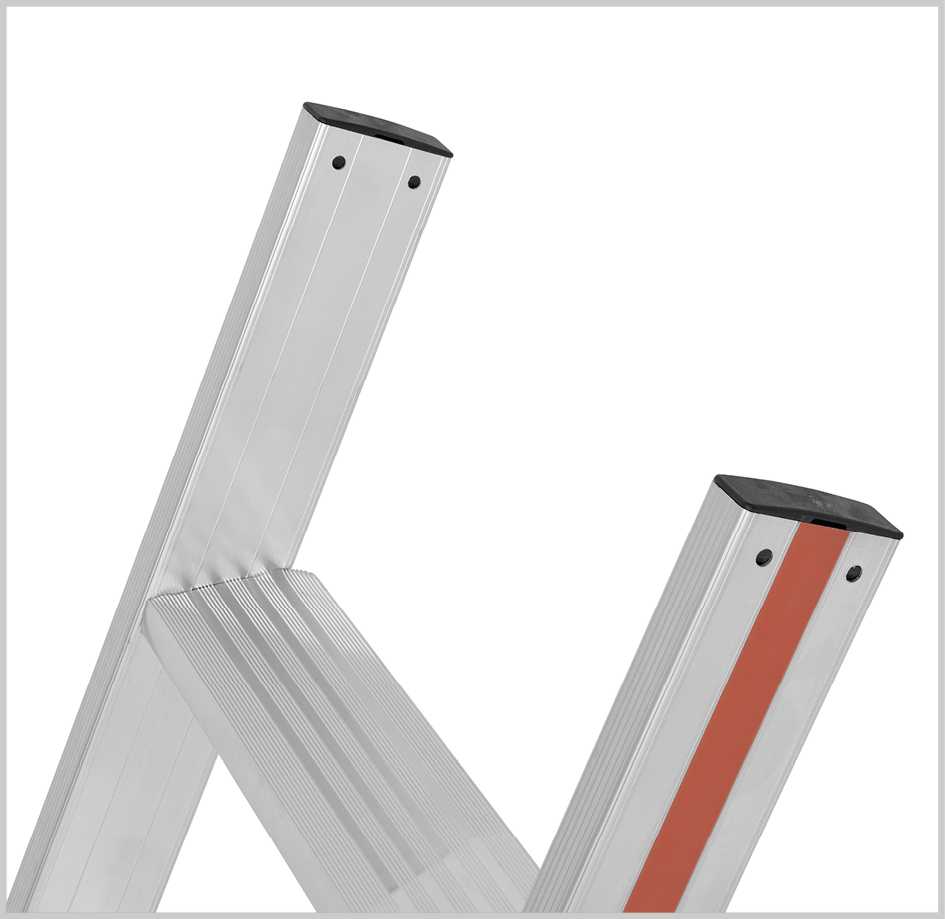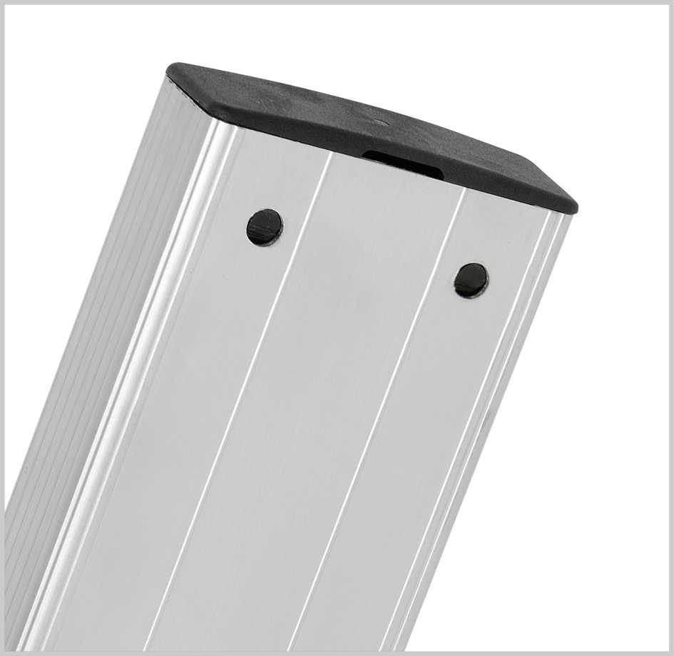 Mit Holm verschraubte Leiterfüße im Anstellwinkel mit großer Auflagefläche und hoher Standfestigkeit.