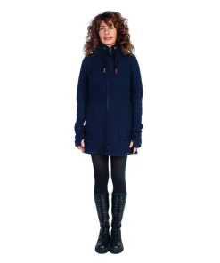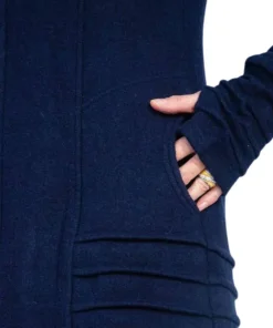 Der Merinomantel „Manzana“ Navy aus Merinowolle ist gerade geschnitten, hat eine 2 in 1- Kapuze mit Reißverschluss und Kordel (wandelbar zum Stehkragen),