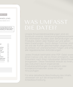 – Komplettpaket: Mit unserem Komplettpaket erhalten Sie nicht nur das Zertifikat, sondern auch wichtige Zusatzunterlagen wie Pflegehinweise, Einverständniserklärungen und die Kundenkartei. Diese können Sie direkt in Ihrer Praxis verwenden, um die Behandlung professionell und effizient durchzuführen.