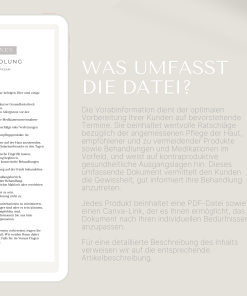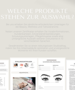 – Hygieneplan: Ein ausführlicher Hygieneplan stellt sicher, dass Ihre Behandlung stets unter hygienischen Bedingungen durchgeführt wird, was für das Vertrauen Ihrer Kunden entscheidend ist.